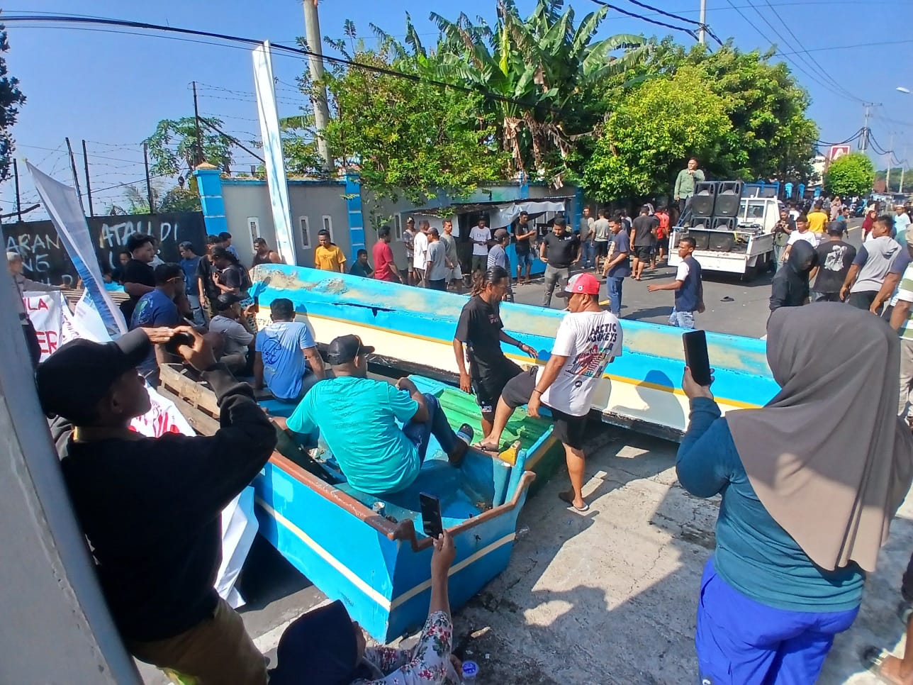 “Berdasarkan Sumber terpercaya yang di Identifikasi Media ini, “Selain menutup jalan, warga juga menumpuk perahu-perahu rusak di tengah jalan sebagai simbol kehancuran ekonomi nelayan. Spanduk bertuliskan “Kami Butuh Breakwater, Bukan Janji!” terbentang di lokasi aksi.