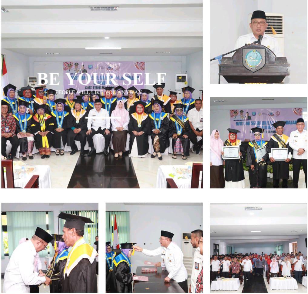 TERNATE — Wali Kota Ternate, Dr. H. M. Tauhid Soleman, M.Si., bersama Ketua TP PKK Kota Ternate, Ny. Hj. Marliza M. Tauhid, secara resmi mewisuda para lansia yang telah menyelesaikan pendidikan Standar 1 (S1) Sekolah Lansia Andalan Kota Ternate. Kegiatan tersebut berlangsung di Aula Baabullah Kantor Wali Kota Ternate, Rabu (17/12/2025).