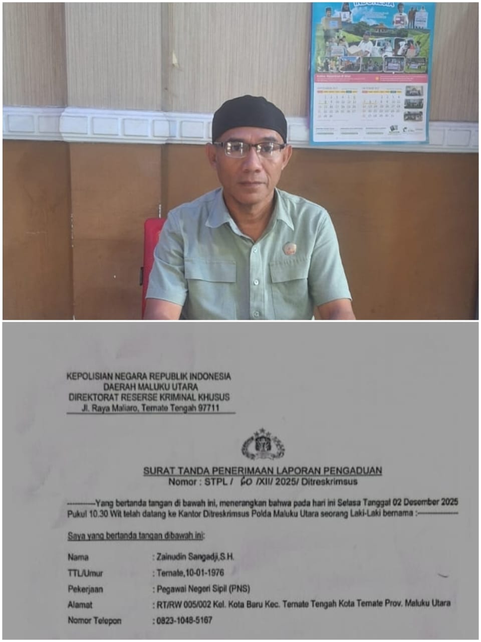Ternate — Seorang Pegawai Negeri Sipil (PNS) Di Lingkup Dinas Tenaga Kerja Dan Transmigarasi bernama Zainudin Sangadji, S.H. resmi melaporkan pemilik akun TikTok @SGBN Maluku Utara ke Direktorat Reserse Kriminal Khusus (Ditreskrimsus) Polda Maluku Utara pada Selasa, 2 Desember 2025. Laporan tersebut tertuang dalam Surat Tanda Penerimaan Laporan Pengaduan (STPL) dengan nomor STPL/60/XII/2025/Ditreskrimsus.